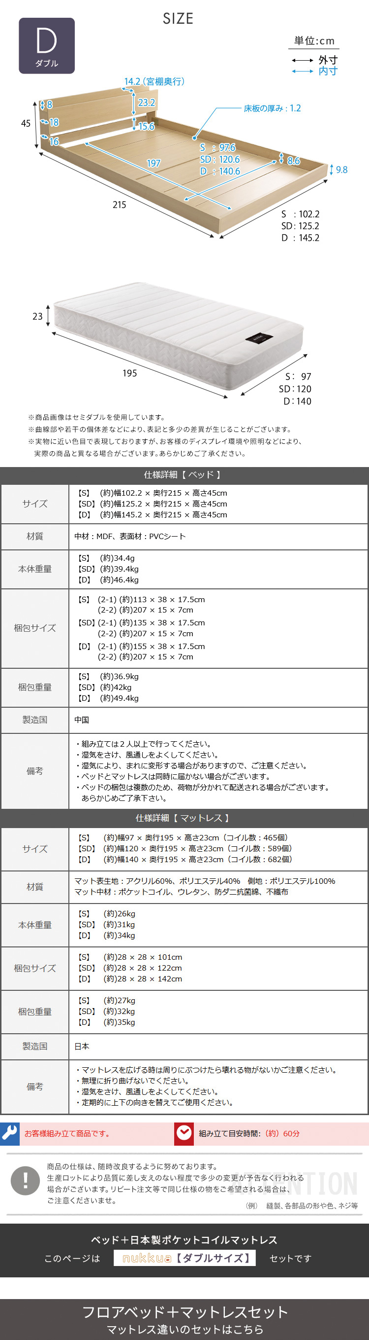 マットレスD:(約)幅140×奥行195×高さ23cm(コイル数:682個)