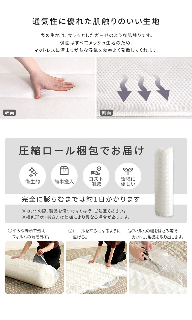 マットレス中材:ポケットコイル、ウレタン、防ダニ抗菌綿、不織布
