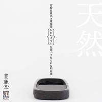 宮城県産出の雄勝硯を使っています。雄勝硯は黒色硬質粘板岩で、鋒鋩(墨を削るヤスリ状のもの)がきめ細かく密集している、磨り心地滑らかな天然小型硯です。「天然」とは外形を自然風に作硯していることをいいます。