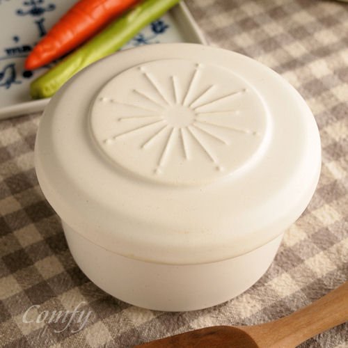 ≪使用上の注意≫ 電子レンジ使用の際、必ずジャーのふたをしたままで温めてください。 冷凍保存の場合、解凍キーにて解凍もしくは冷蔵庫にて解凍した後、温めをしてください。 レンジで温めた後は、本体がとても暑くなっています。素手で直接触れないでください。また、テーブルには敷物をご用意下さい。 多孔質の陶器は、特性上、低強度です。衝撃により縁や突起物が欠けやすいので、お取り扱いは充分にご注意ください。 ごはんのこびりつきは、ジャーをぬるま湯に浸した後、スポンジ等でこすり落としてください。 他の食材を保存する場合、臭いが残ることがあります。また、汁気の多いものは水分が染み出ることがあります。 使用後はできるだけ早く水洗いし、よく乾燥させてから収納してください。 食器洗浄機でのご使用はお避けください。サイズ:Φ11.5cm×高7.5cm 素材:陶器 容量:約一膳分 温めの目安:2分〜2分半(ごはんの量、電子レンジによっても異なります。)