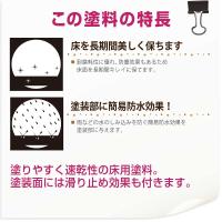 【特長】■塗りやすく、乾きが速く、塗装面はすべりにくい。■耐磨耗性にすぐれ、防塵効果があります。■簡易防水効果があり、雨などの水