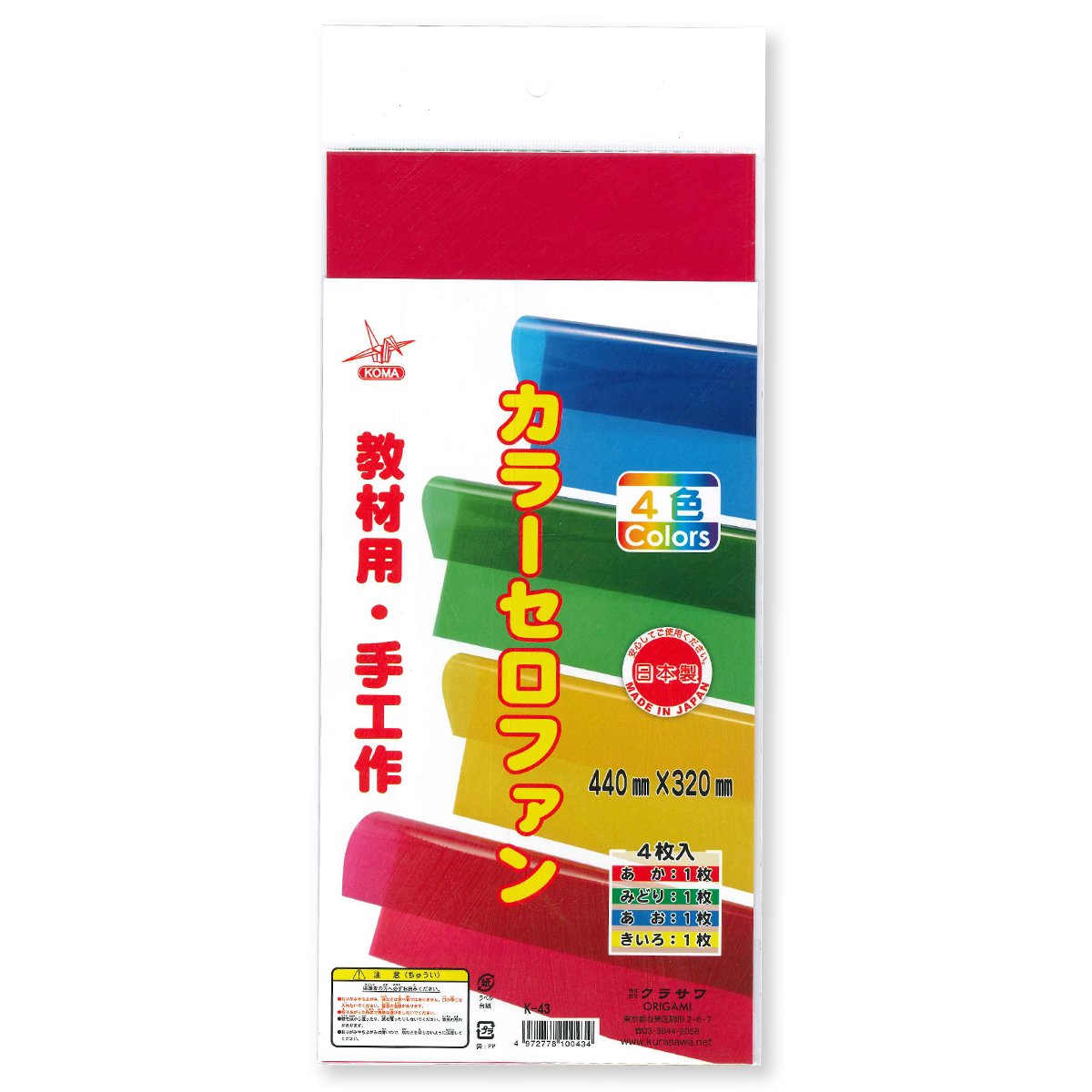 商品名:クラサワ カラーセロファン 4色 各1枚 4枚入り 440x320mm K-43 日本製