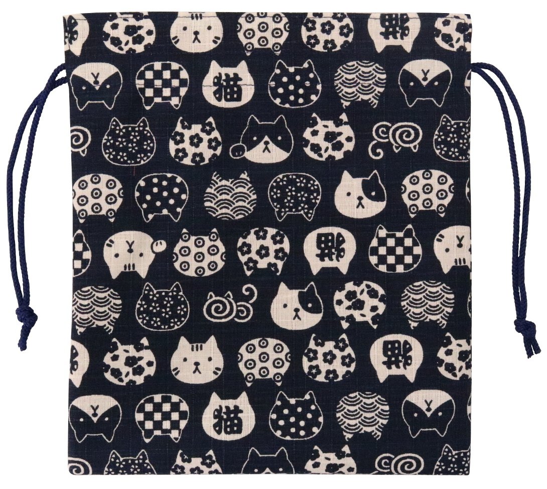 京佑 巾着 袋 御朱印帳 小物入れ 猫 和柄 綿 日本製 にゃんこもん 紺 22.5×22.5cm