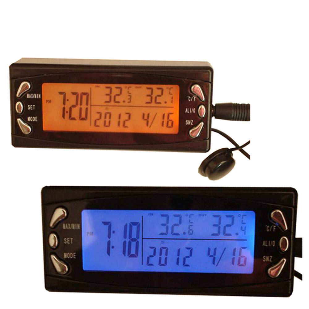 <br>特徴: <br>時間とカレンダーの表示(年、月、日、時、分、時) <br>12/24時間変換 <br>°C /°F表示 <br>屋内および屋外の温度計 <br>最高および最低温度記録 <br>車の電源プラグ1.5メートル <br>青とオレンジのバックライト <br>記録機能をクリアする <br>アラートリング <br>変換位置 <br>後ろのマジックテープ <br>屋外センサー1.5メートル<br> <br>仕様 <br>LCDディスプレイ:6.1 * 2.3cm <br>バッテリー:AG13 x 2個 <br>材質:ABS <br>カラー:シルバー <br>重量:0.115kg <br>サイズ:92 * 40 * 22ミリメートル