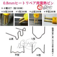 ・樹脂部分補修の強い味方!0.8mmヒートリペア用電熱ピン200本セットです。車両のライトユニット、フロントグリル、バンパー、ラジエターサポート、二輪車のカウリング等、樹脂パーツの割れた面の補修、補強にご使用ください。M型、山高、平型、V型、ミックスの各種バリエーションを揃えておりますので、用途に合わせてご選択いただけます。