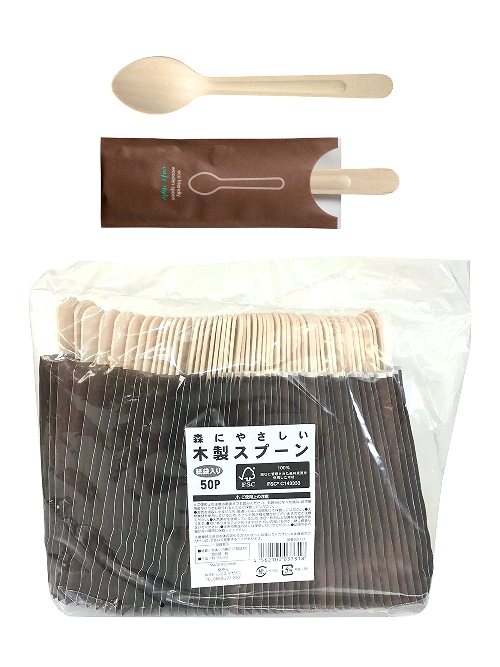 商品名:ストリックスデザイン 使い捨てスプーン 木製 個包装 紙袋入り 50本 15.8cm 森