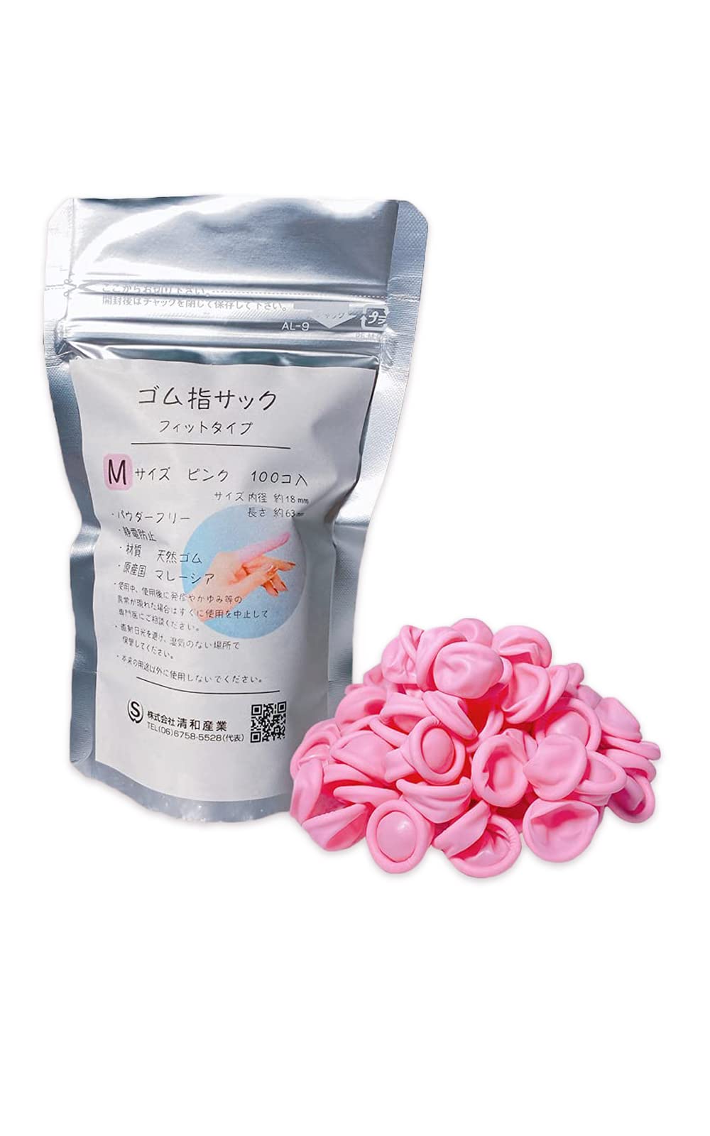 指にぴったりフィットする天然ゴムの薄型指サックです。あかぎれ、ひび割れ、さかむけ等指先の保護に。また軟膏塗布,口内衛生の介助等指先の衛生管理に。感染防止用にもおすすめです。また、パウダーフリーの為コーンスターチ等のアレルギーの方も心配なくご使用になれます。さらに静電防止品なので、精密機器・部品関連の検査時にもご利用頂けます。ジェルネイルのオフ時にもかわいいピンクで人気です。お得な100個入り。紫外線による劣化を避けるためにアルミ製チャック付き袋に入っています。