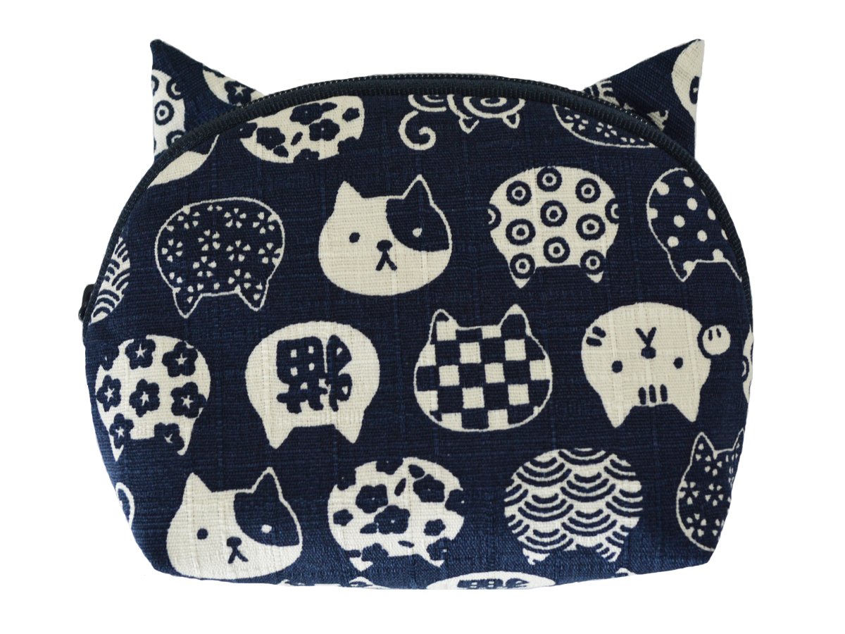 商品名:京佑 日本製 京都 猫柄 ポーチ 小物入れ 和柄 綿 にゃんこもん 耳付き 紺