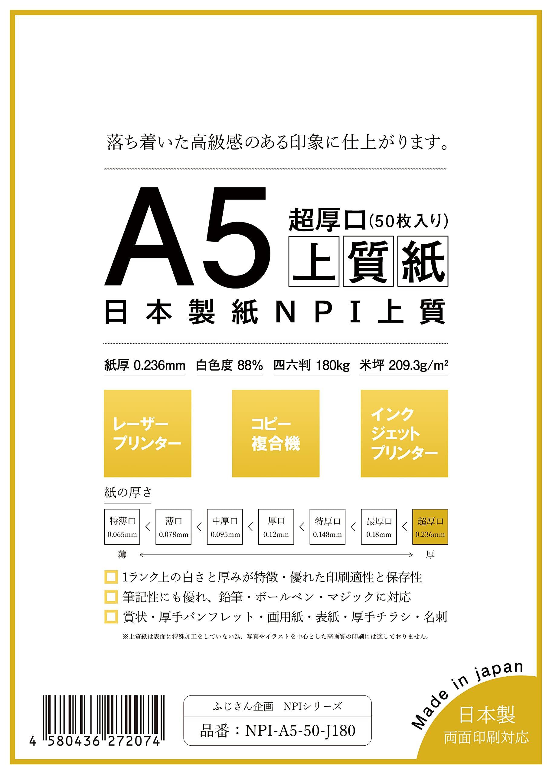 日本製紙 「超厚口」 NPI上質紙 A5 50枚 日本製 白色度88% 紙厚0.236mm 四六判表記180kg NPI-A5-50-J180