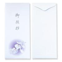 香典返しの返礼品に添えてご使用いただく巻紙挨拶状。挨拶状文面用紙は奉書紙(和紙)に胡蝶蘭の絵柄入り。 胡蝶蘭の花言葉は「清純な愛」。感謝の想いを伝える挨拶状。 文章印刷済みの商品になります。お名前などの追加文字入れ印刷はできません。 印刷機を使用した薄墨印刷をしております。封筒表面には御挨拶の文字が入っております。 挨拶状があと少し必要、数枚だけ必要、などの場合におすすめです。 文章をご確認の上(宗教