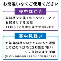 喪中・寒中見舞いの文章が印刷されたはがき。文章と絵柄をご確認いただきご購入ください。 喪中はがき(年賀状を辞退する内容、11月ごろから年末に使用)、 寒中見舞い(年賀状の返信に使用します、お正月期間明けから節分までに使用)。 ハガキ宛名面の〒枠(郵便番号枠)はグレー色になります。弔事用・仏事用になります。 はがき用紙対応の一般的なインクジェットプリンターで印刷が可能な用紙。 商品は私製はがきになります。ご使用投函時には切手を貼ってご使用ください。