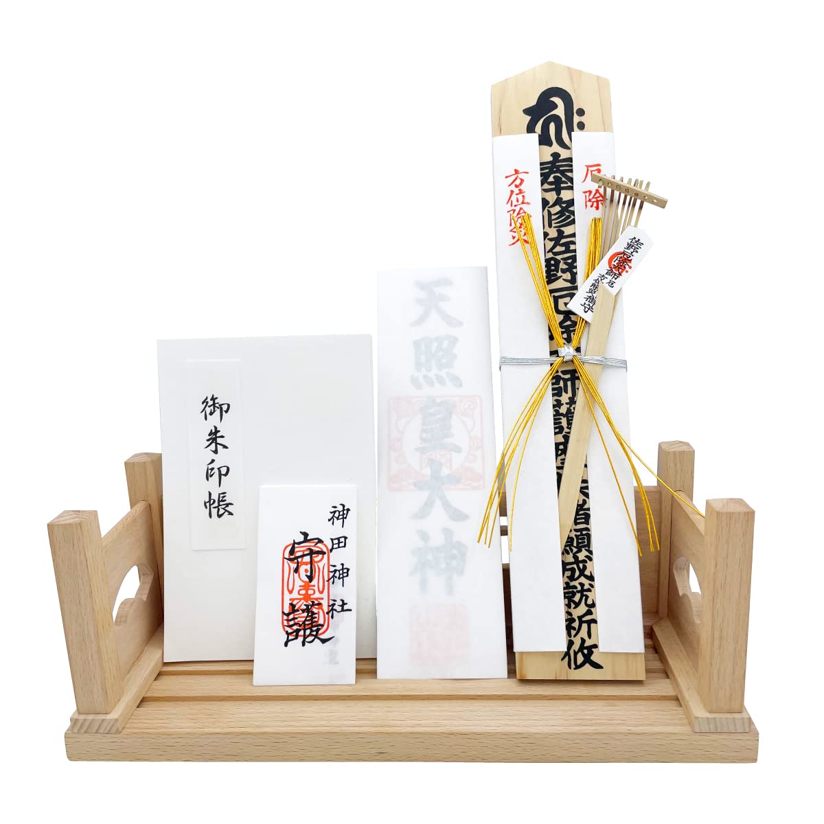 様々なお札や神具をお祀りいただけるお札立てです。 内容物:本体・説明書・壁留め用ピン お届け時に箱から出してすぐにお祀り頂ける完成品 【ご注意】※写真の御札や御守り御朱印帳は付属致しません。 天然木の為、木目、節、風合い(自然キズ、節目)など、画像と若干異なる場合がございます。