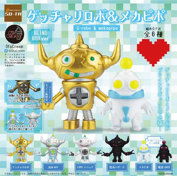 全6種よりメーカー規定の比率に従い封入。●「OTACREAM」が手掛ける大人気ソフビ「ゲッチャリロボ」と「メカピポ」が手のひらサイズのフィギュアとなって登場●可愛らしい2頭身のフォルムは、頭部が着脱可能。メカピポも含め、差し替え遊びが楽しめる●ゲッチャリロボの両腕に仕込まれた武装を再現できる差し替え用腕パーツがブラインドボックス版限定で付属【ラインナップ】ゲッチャリロボ抗体APP(ブラインドボックス版限定カラー)LOVEデバッグ怪奇ハザードメカピポ電波JACK