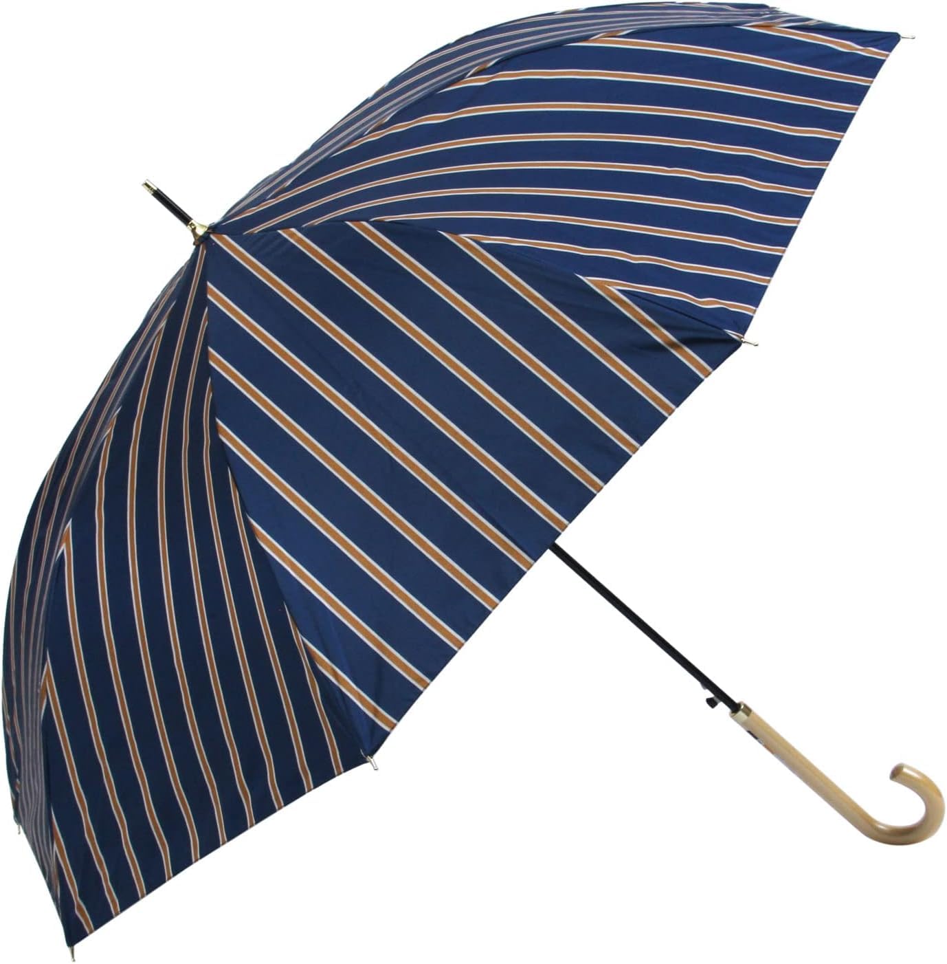商品名:長傘 レディース 晴雨兼用 内側 日傘コーティング UV&遮光 99% 58cm ワンタッチ ジャンプ傘 丈夫 耐風 グラスファイバー骨 おしゃれ 木ハンドル かわいい ストライプ ネイビー