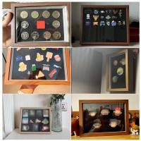 ●製品名前:額縁式ピンバッジ展示用コレクションケース。●素材:フェルト、木、金属、アクリル。●スタイル・サイズ:クルミ・21.9*17.8cm。ケース厚さ5cm、フェルトページ厚さ9mm。