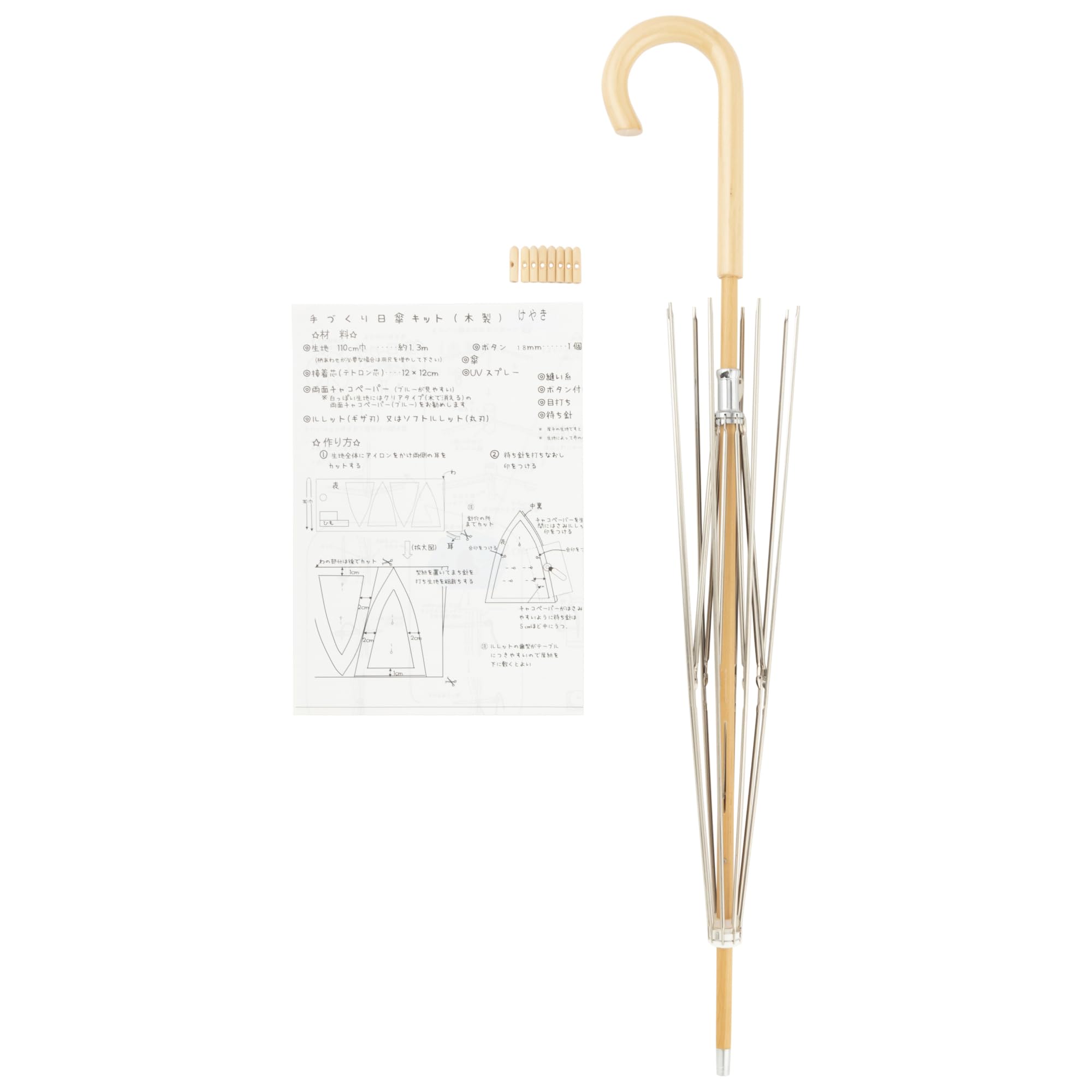 商品名:フクサン 手作り日傘キット 高級ケヤキ棒 銀骨 白木持ち手 AK-105 つゆ先、作り方説明書、実寸大型紙付き