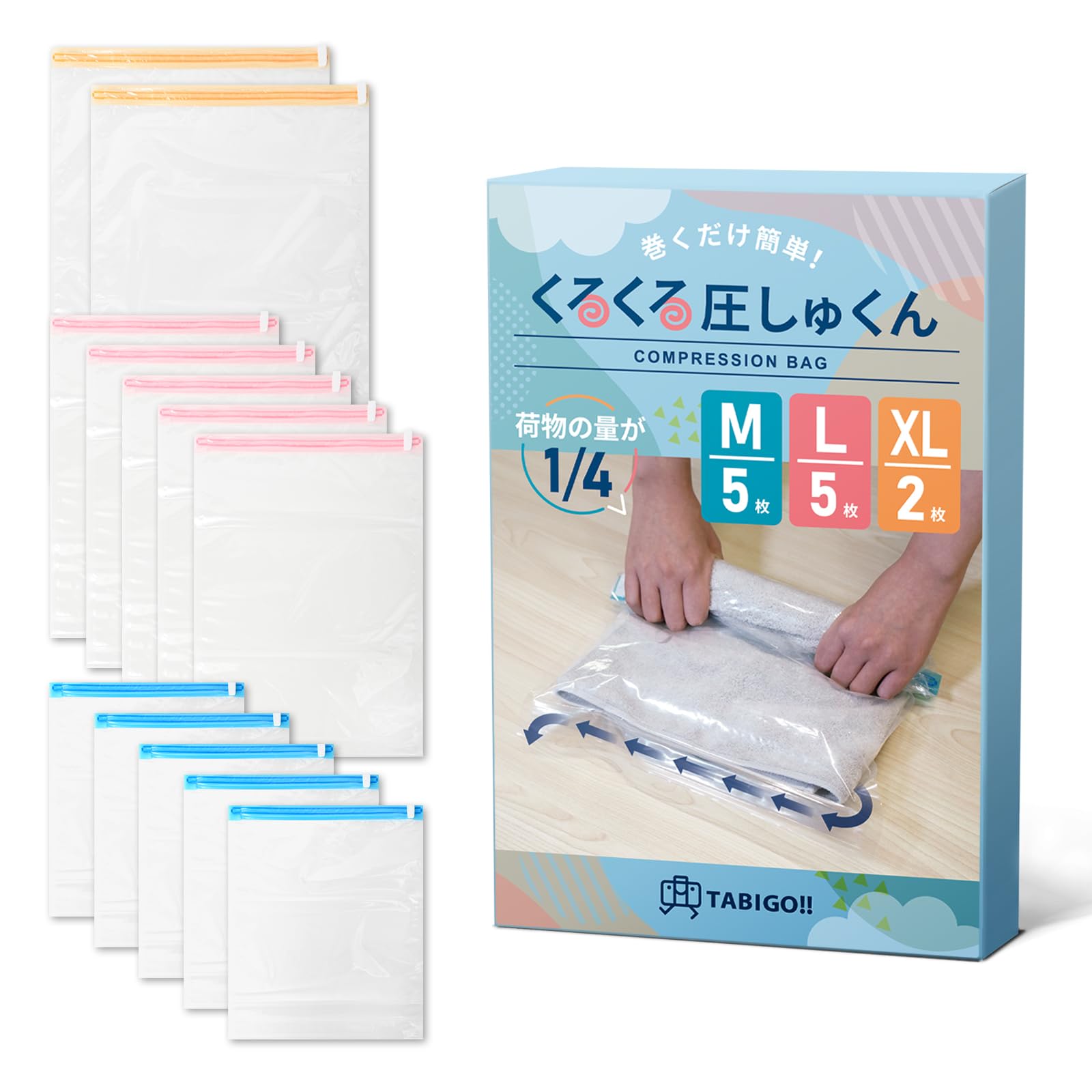 【じゃらん掲載】 TABIGO!! くるくる圧しゅくん 圧縮袋 旅行 衣類 洋服 真空 収納 手巻き トラベル 便利グッズ (M5枚/L5枚/XL2枚