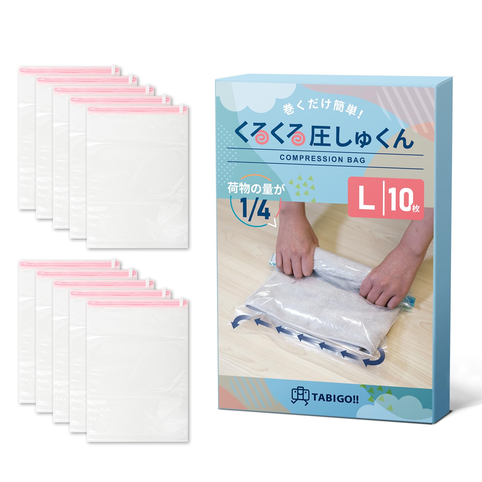 【じゃらん掲載】 TABIGO!! くるくる圧しゅくん 圧縮袋 旅行 衣類 洋服 真空 収納 手巻き トラベル 便利グッズ (L10枚)