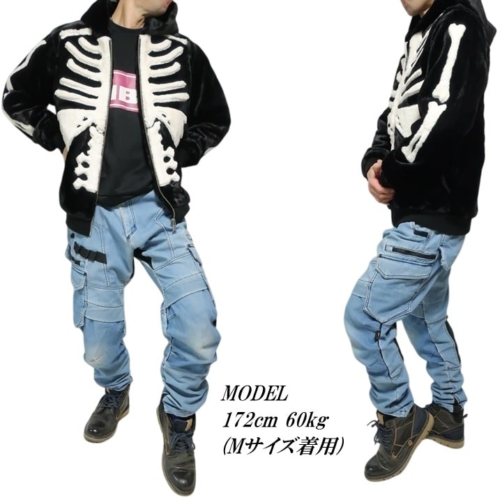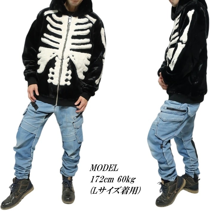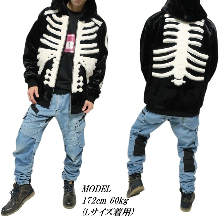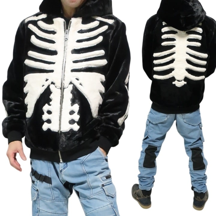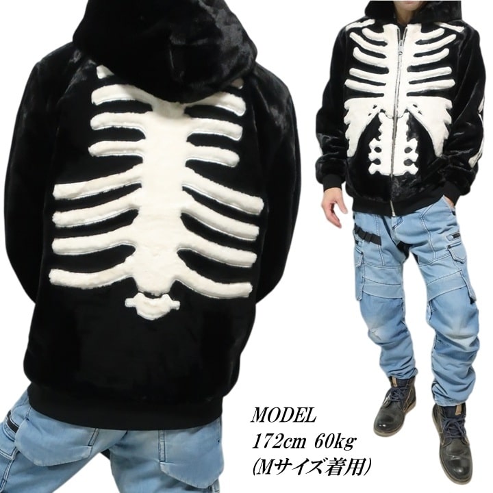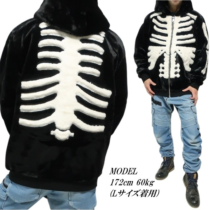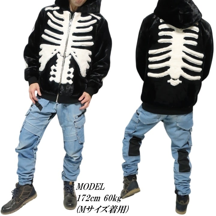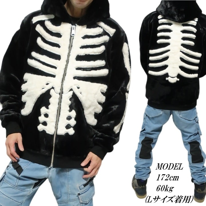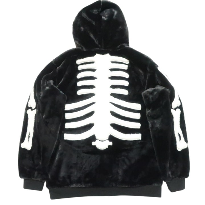 もこもこのフェイクファーに、 闇夜で浮かび上がるようなスケルトンボーン。 着心地はあたたかく、見た目はエッジ最強。 “人が着てない服を着たい” あなたの願いを、 ガッツリ叶えるジャケットです。