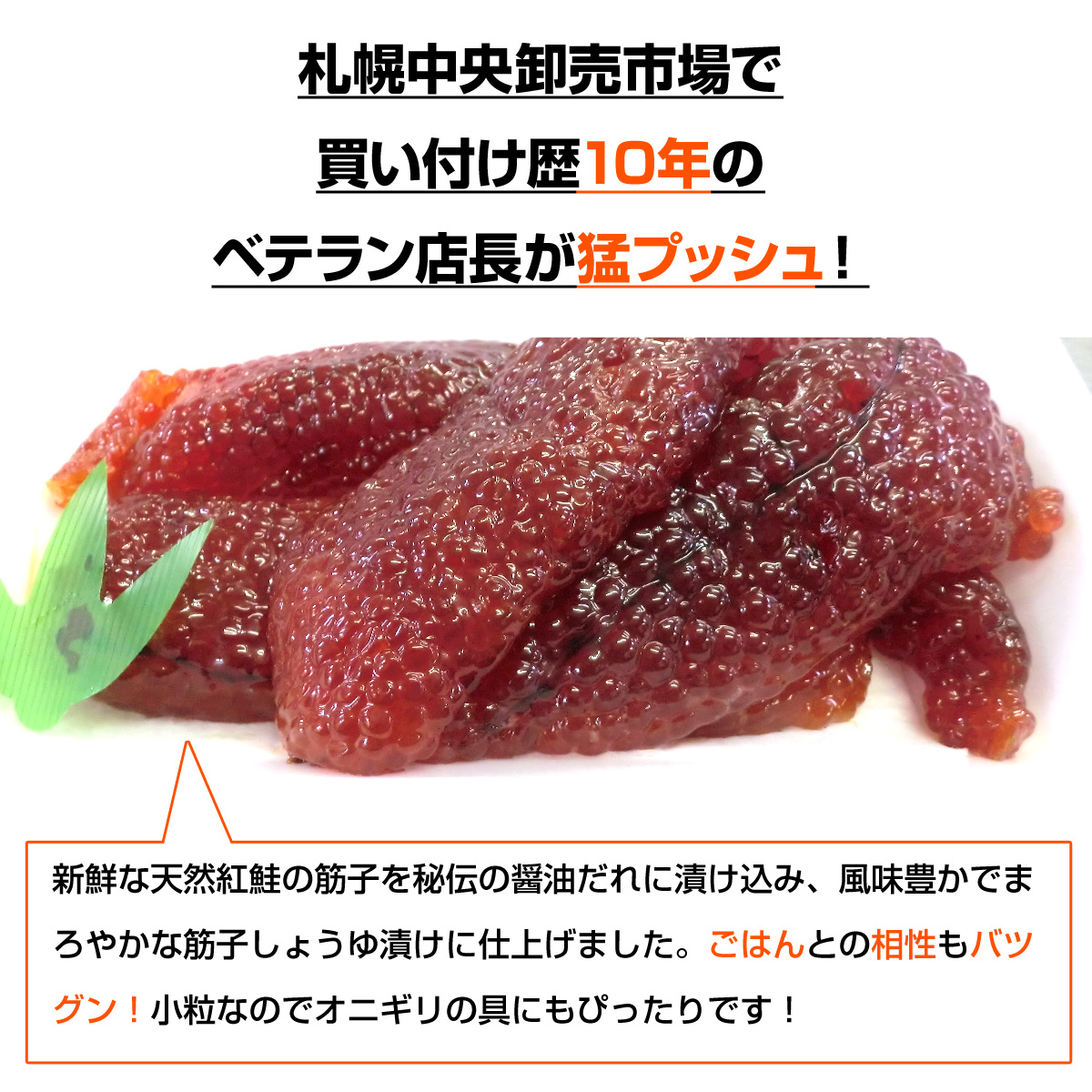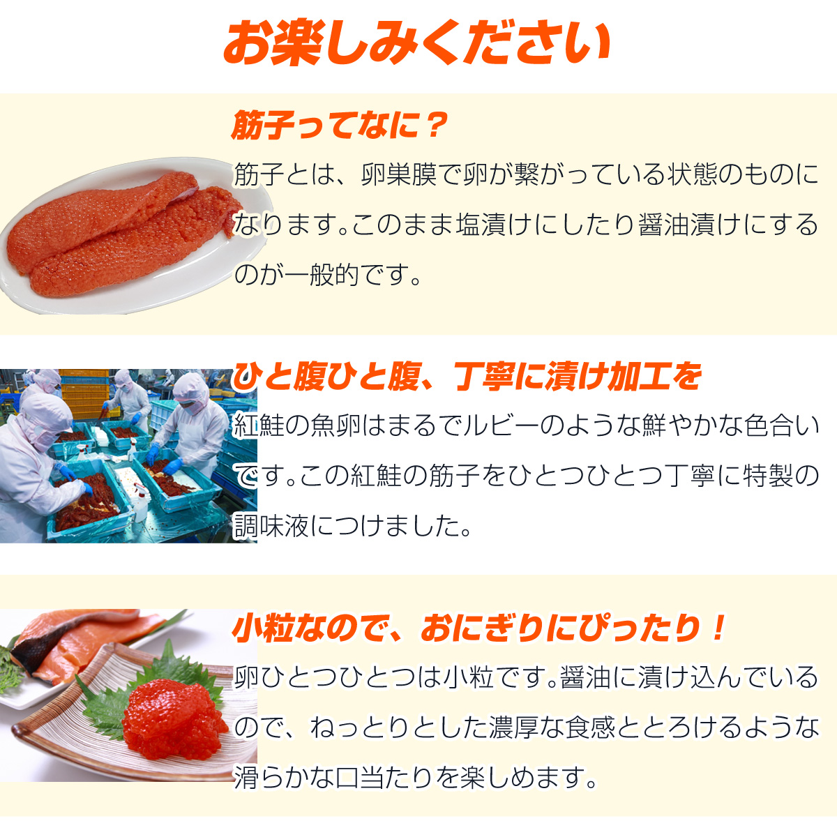 | 原材料 | 紅鮭卵(アメリカ)、醤油、食塩、米醗酵調味料、魚介エキス、還元水飴/調味料(アミノ酸等)、酸化防止剤(V.C)、着色料(赤102、黄5)、発色剤(亜硝酸Na) |
