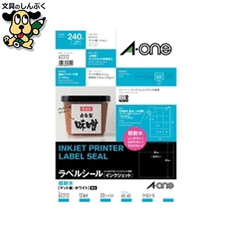 水に濡れてもにじまない・やぶれない・はがれない。エーワンラベルシール「インクジェット」超耐水シリーズ。●入数:20枚●面数:12面(角丸)●片数:240●総厚[μm]:220μm●ラベル厚:110μm●適応機種:インクジェットプリンタ●色:ホワイト(マット)●規格:12面(角丸)●材質:上質紙+インクジェット専用塗工