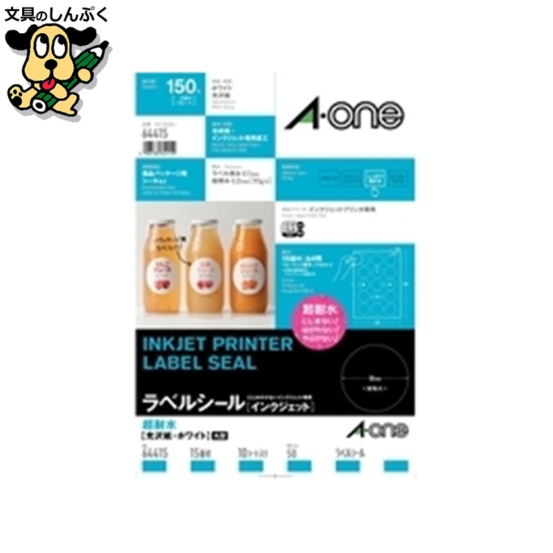 水に濡れてもにじまない・やぶれない・はがれない。エーワンラベルシール「インクジェット」超耐水シリーズ。●入数:10枚●面数:15面●片数:150●総厚[μm]:220μm●ラベル厚:110μm●適応機種:インクジェットプリンタ●色:ホワイト(光沢)●規格:15面(丸型)●材質:合成紙+インクジェット専用塗工