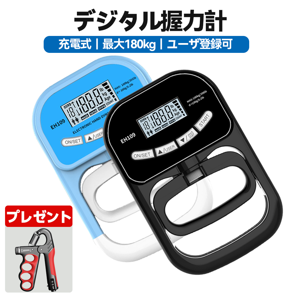 最大「180kg」を測定できるデジタル握力計、便利な「充電」と「電池」両対応、単位変換(kg/lb)、ハンドル調節可、大画面液晶表示、ユーザー登録、2カラーよりお選びいただけます。