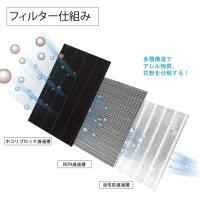製品機能 | 【HEPA集じんフィルター機能】:花粉、アレル物質(ダニの ふん・死がい)、カビ菌、 ホコリ・チリ、タバコの 煙(粒子)、ペットの毛など を捕集します。 【脱臭フィルター機能】:タバコの煙(ニオイ)、トイ レのニオイ、生ゴミの ニオイ、ペットのニオイ などの生活臭を吸着・分解 します。 |