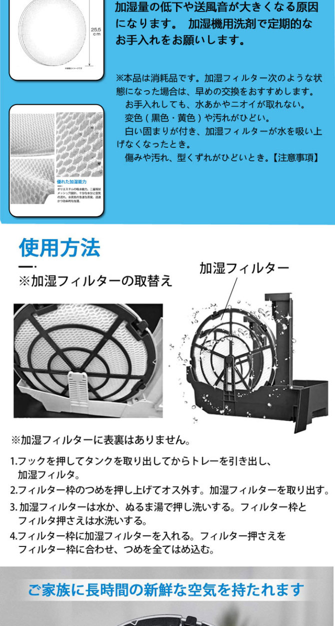製品機能 | 加湿フィルター抗菌、防カビ方法: フィルターに抗菌・防カビ剤を含浸、 |