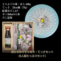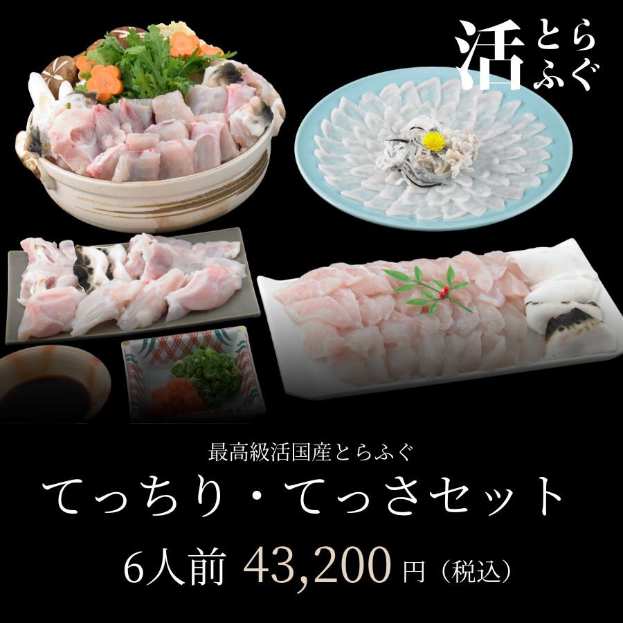 ふぐ 活とらふぐ てっちり・てっさセット 6人前 てっさ150g とらふぐ(身・アラ)1.1kg もみじおろし 活とらふぐ皮 とらふぐひれ8枚 ポン酢セット 黒門市場