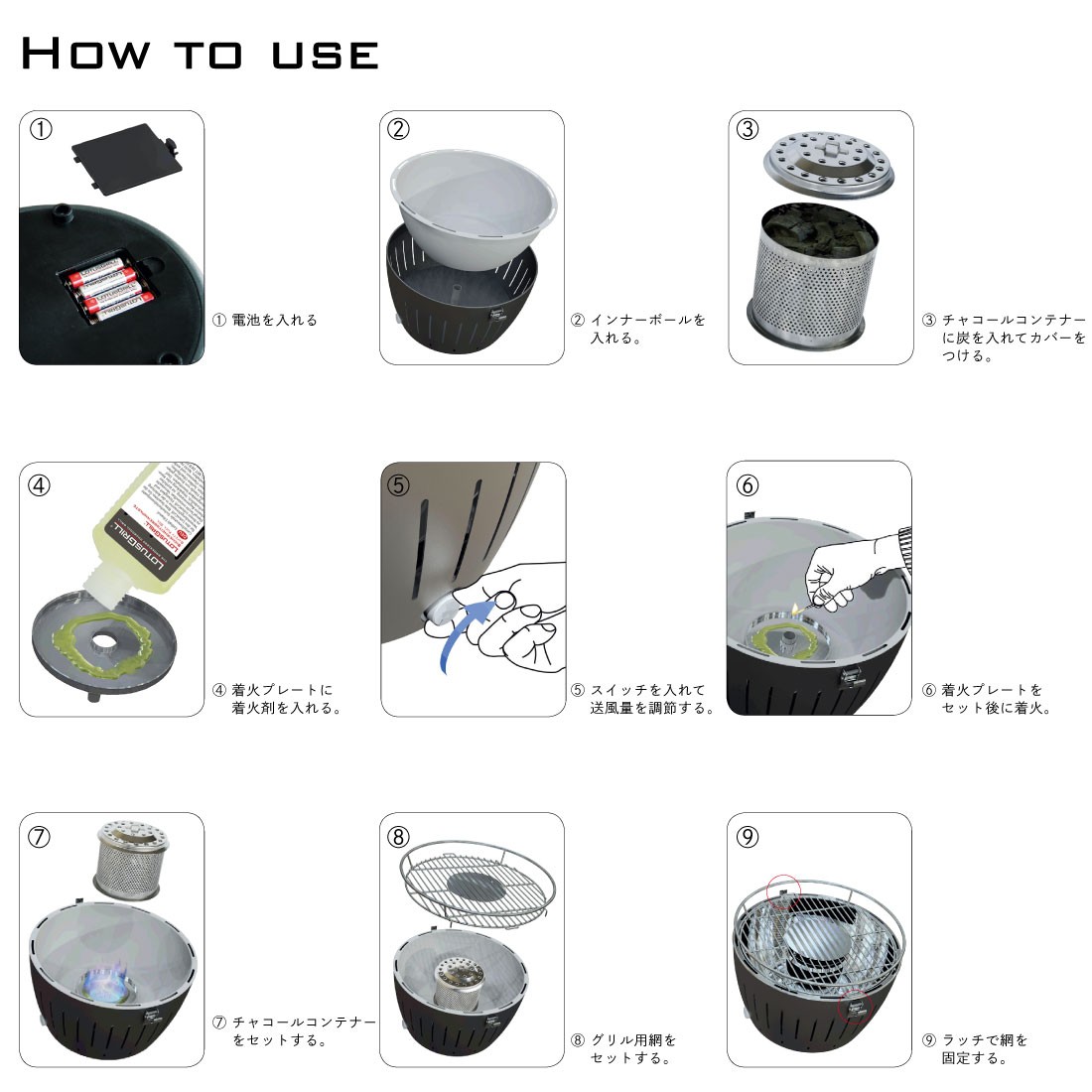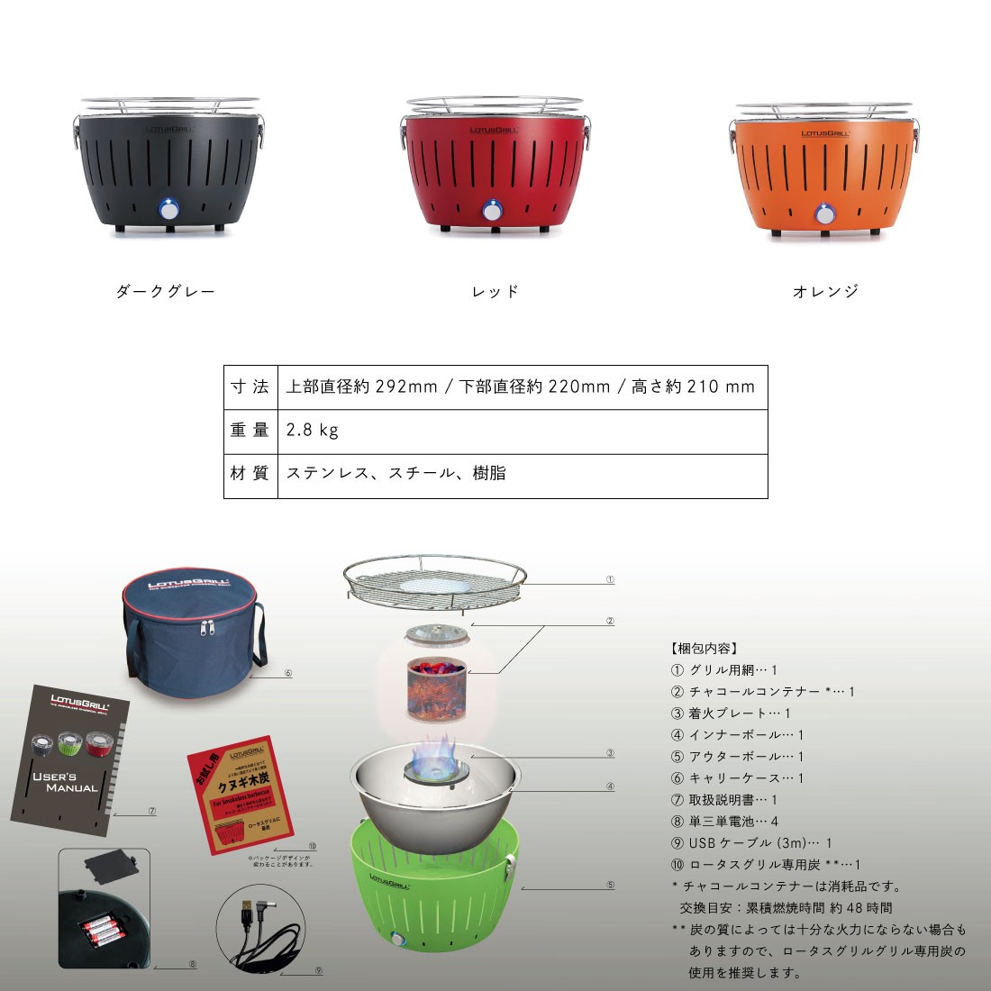 単三単電池:4/USBケーブル (3m):1/ロータスグリルくぬぎ炭:1