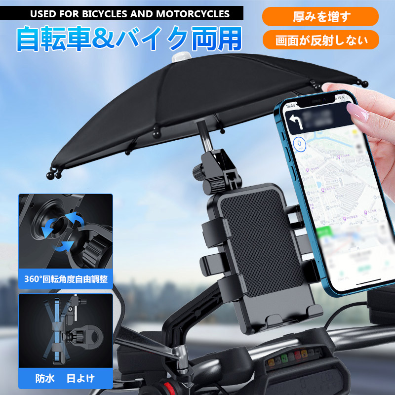 自転車 スマホホルダー バイク スマホスタンド 傘付き 携帯ホルダー 自動ロック サイクリング ロードバイク 360度回転 防振 落下防止 取付簡単爆買