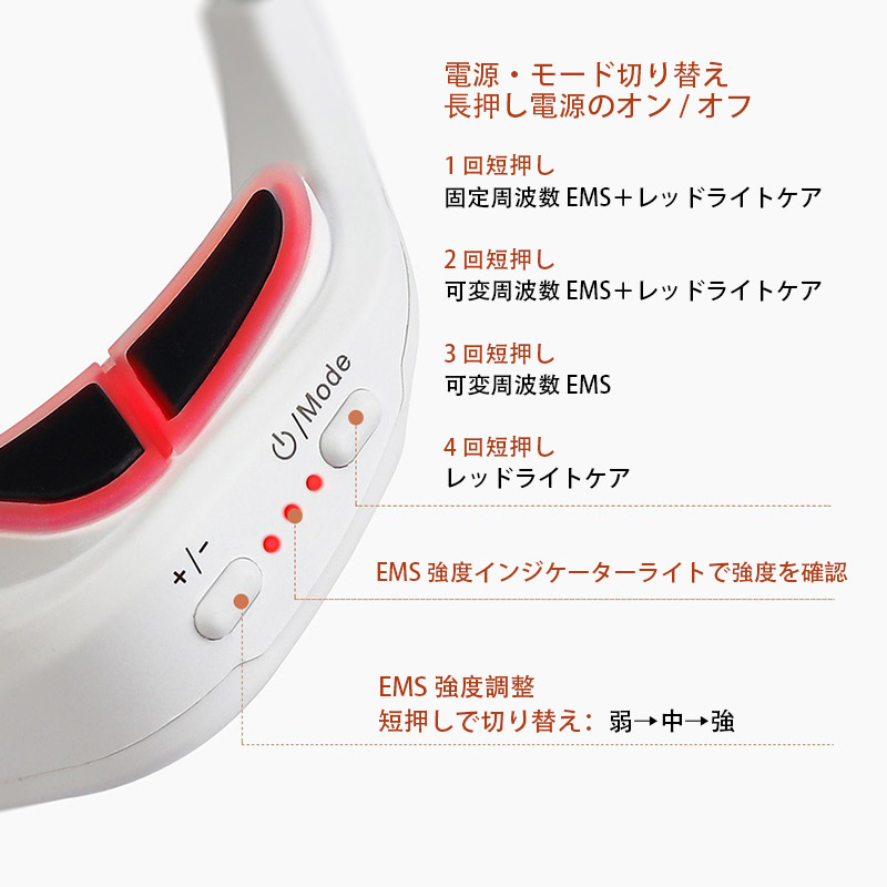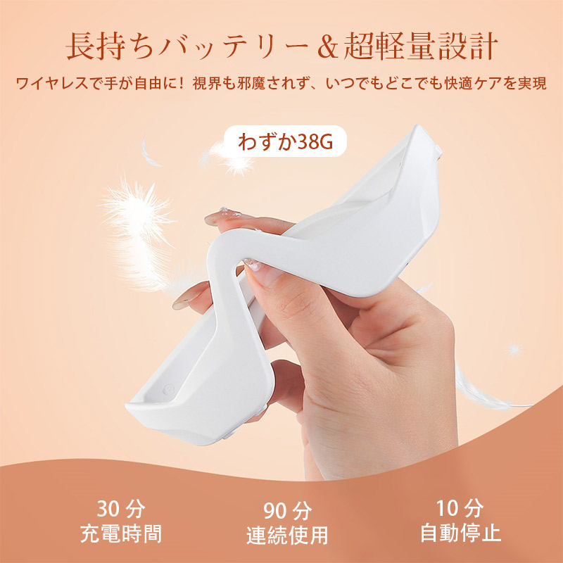目元のカーブにフィットする形状で、使用中にずれにくく、眼瞼や眼袋の部位を正確にケアできます。軽量・コンパクトで、収納や持ち運びにも優れています。