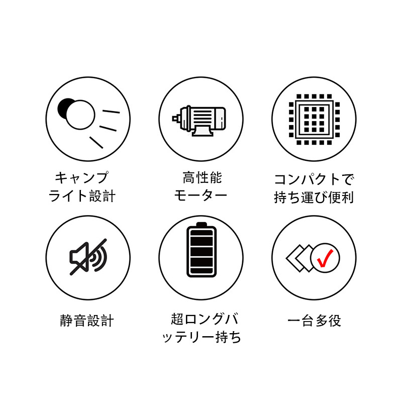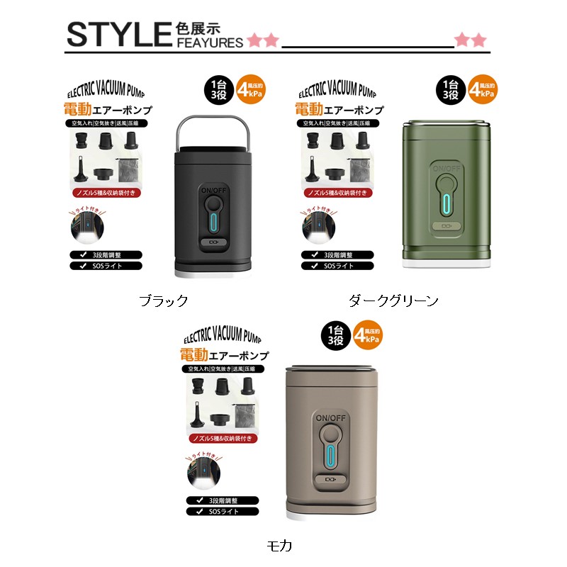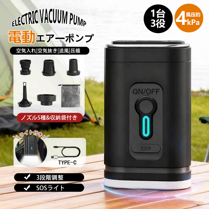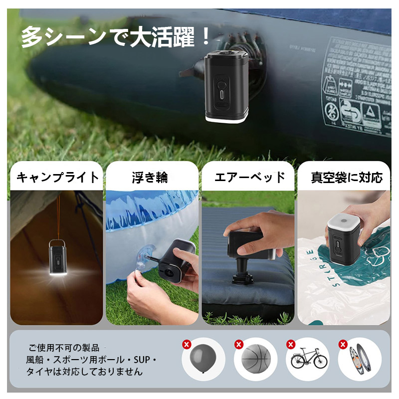 キャンプ・旅行・家庭用に活用可能,充気・吸引・照明ニーズを一括解決。