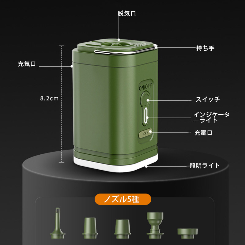 【キーワード】エアーポンプ 空気入れ アウトドア キャンプ ライト付 ハイパワーエアポンプ USB充電 電動ポンプ 軽量 小型 5種のノズル付き 圧縮袋 プール