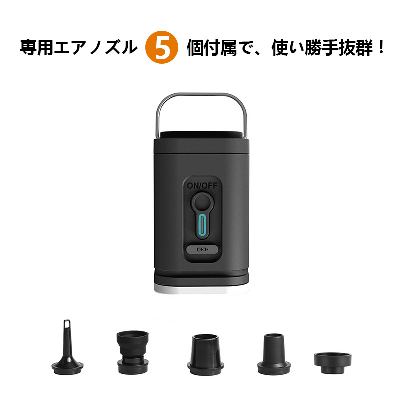 - 5種ノズル:多くのインフレータブル製品に対応,漏れを防ぐ。