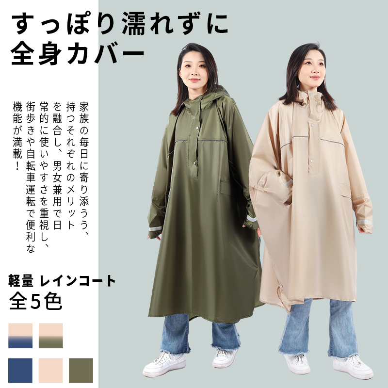 ロング丈で、足元までしっかり覆えて雨を防ぎます。デザインは本来のレインコート式ではなく、ファッションアイテム脱ぎ着を楽にすることができ、レインコートの袖口に付けられたゴムギャザーやマジックテープで、袖口のフィット感が調節でき、雨や風の浸入を効果的に防ぎます。夜間の安全を考慮し、反射帯を前面から背面にかけて体を覆うように採用することで、車などからの視認性も高まり、夜間の自転車でも安全アップ。レインコートには収納袋を付属、レインコートを折りたたんで収納袋に入れお持ち運ぶことが可能で、便利です。