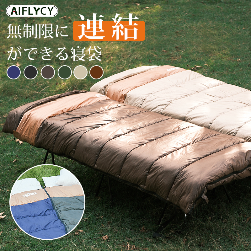 ・新型無制限設計 他社:左右が決まったレイアウトでマックス2枚の組み合わせ AIFLYCY:左ファスナーと右ファスナー2つの寝袋をファスナーで連結して1つに出来る事です。何枚でもレイアウトができます、ご家族5人で寝袋三つのレイアウトでも使用が楽々、キャンプで団体使用も余裕で対応できます。◎