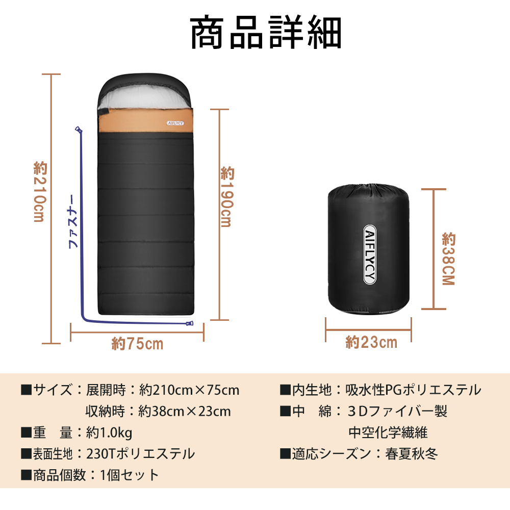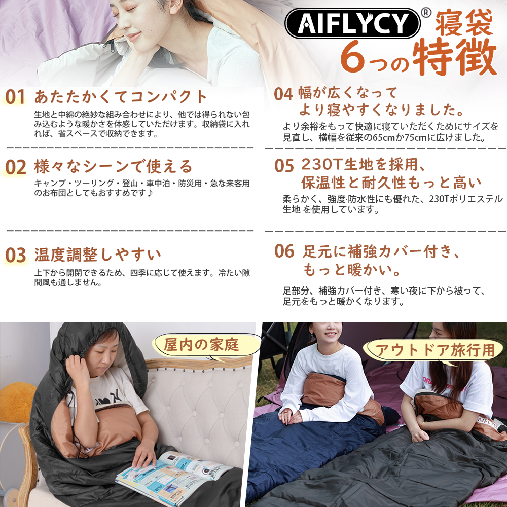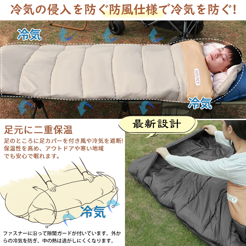封筒型で、内部に余分なスペースがあり、中で手足を伸ばしたり、楽に寝返りを打てますので、窮屈感が全くありません!帽子には収縮コードとマジックテープで襟元も閉めることができ、寒気を防いでちゃんと保温してくれます。ダブルファスナーを採用なので、足元から肩まで、内外側どちらからでも開閉でき、温度調節でも簡単です。足元のファスナーを開けば、足を自由に動かせて快適です。寝袋のポケットには、時計や携帯電話などの小物を収納できます。