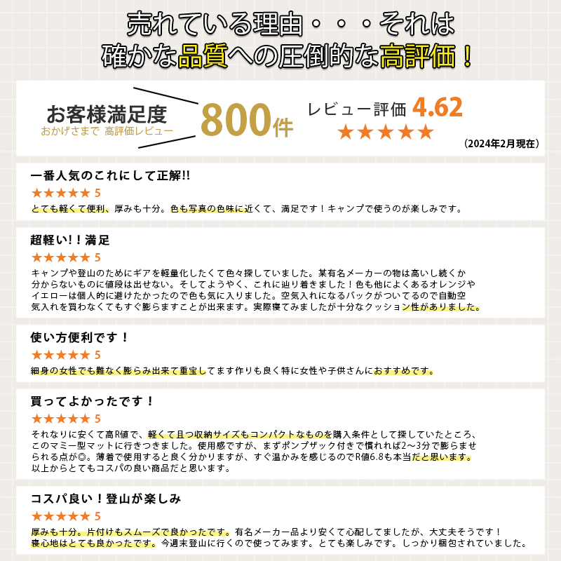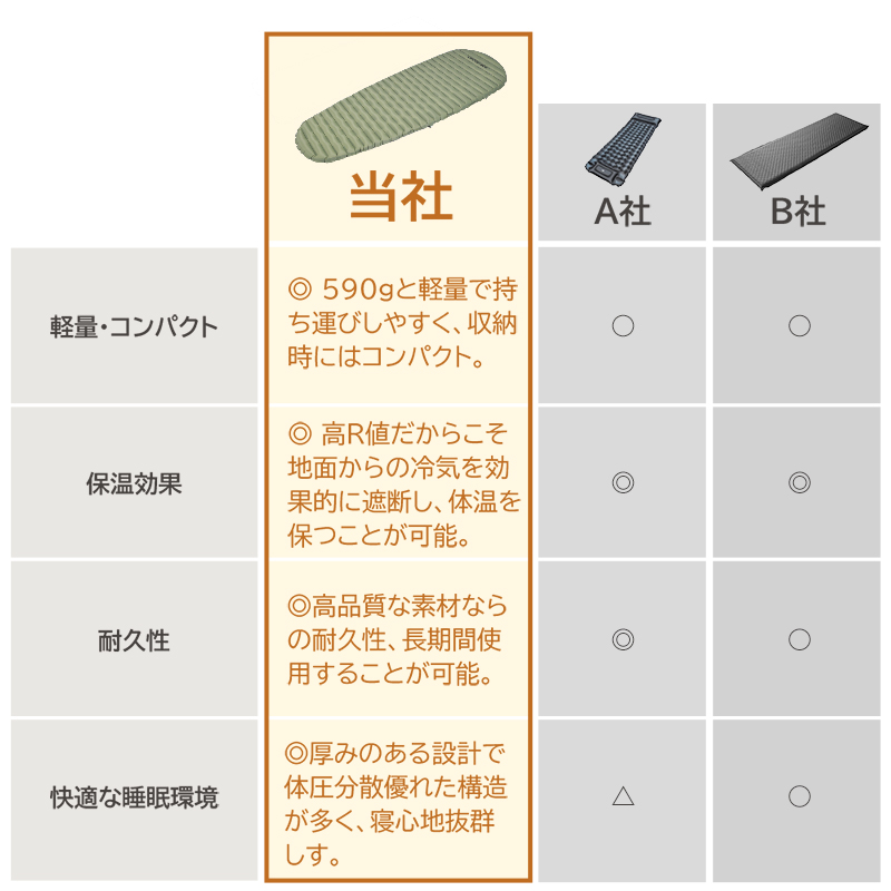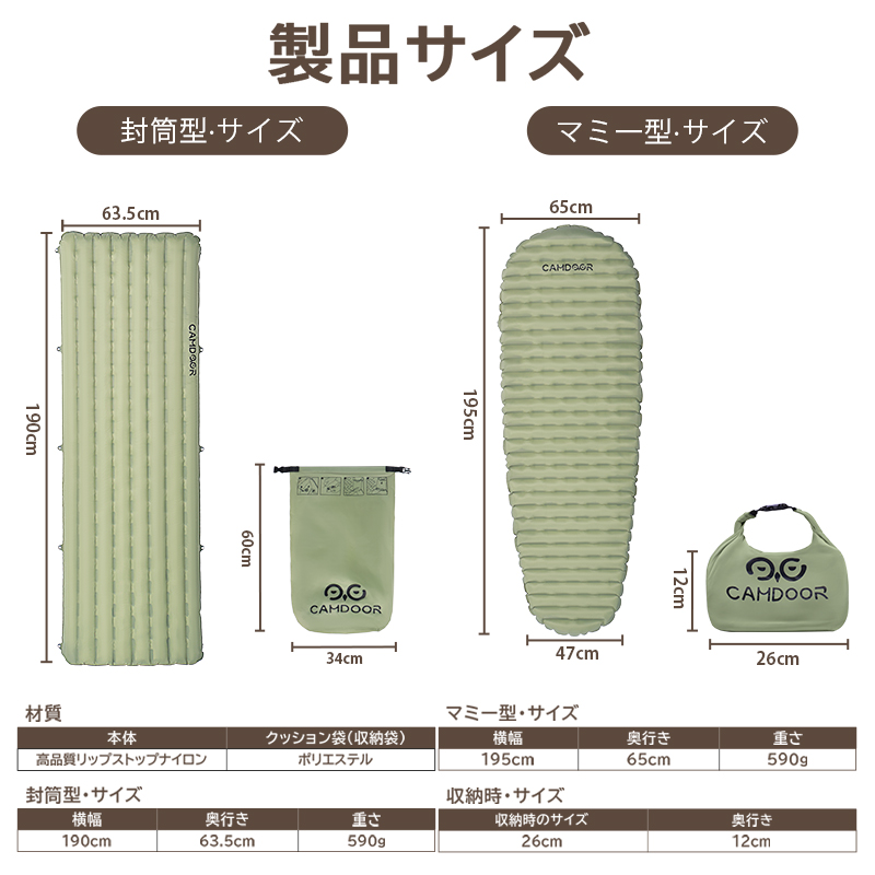 ・大きさ 他社:168*58*5cm camdoor:190*63.5*10cm、厚さ10cm、快適な寝心地◎