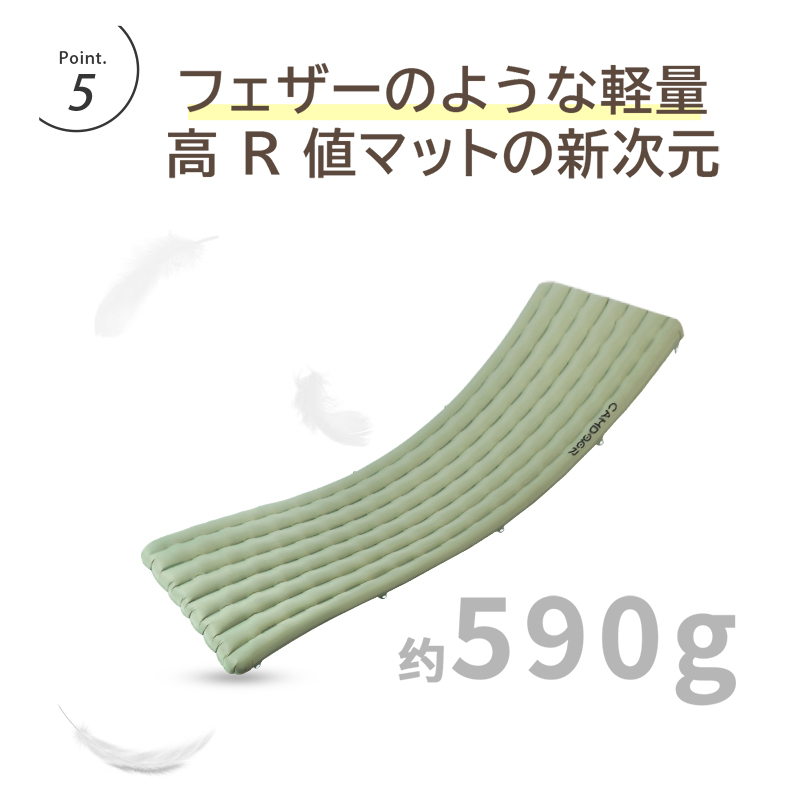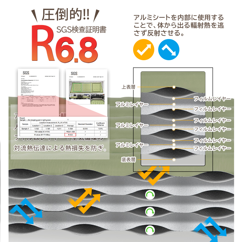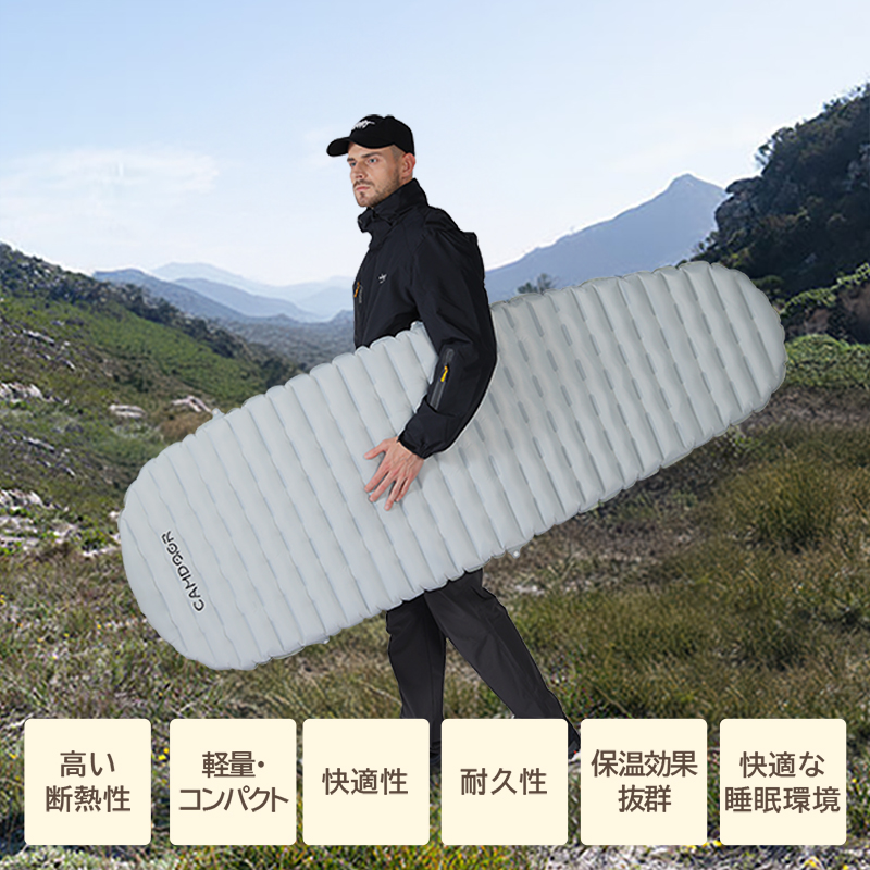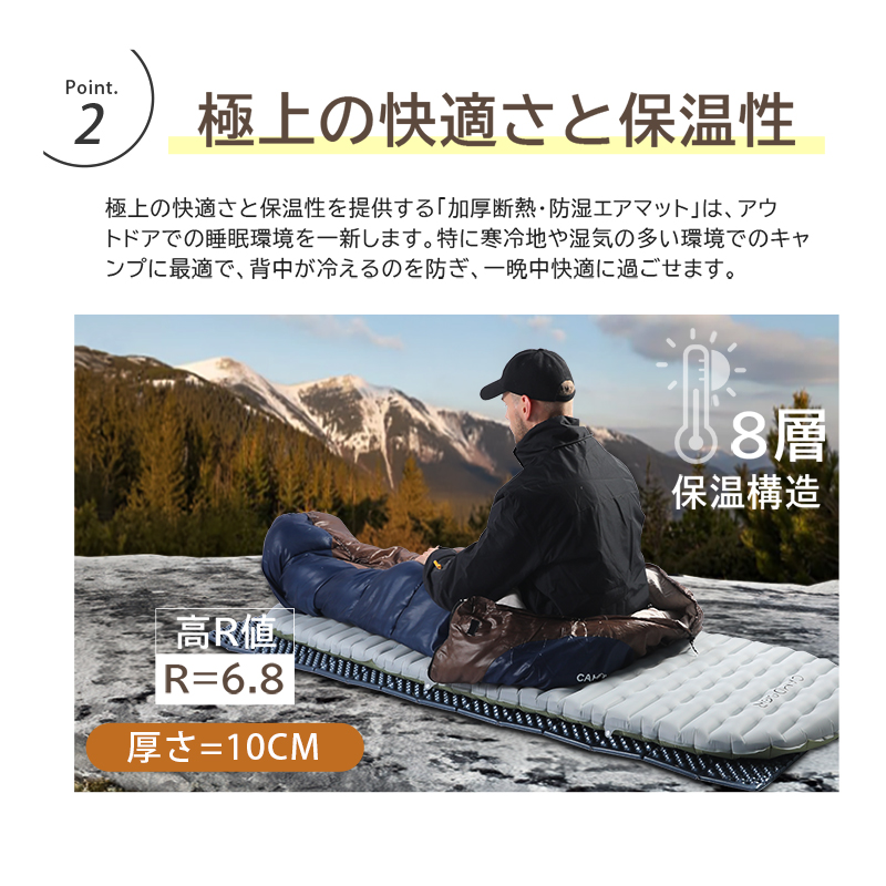 市場より高い6.8の超高R値エアマット。CAMDOORの高R値エアマットはSGS認証取得済みで、極寒環境だけでなく、日常使用にも適用します。寒さに敏感な方には、CAMDOORの高R値エアマットが最適です。