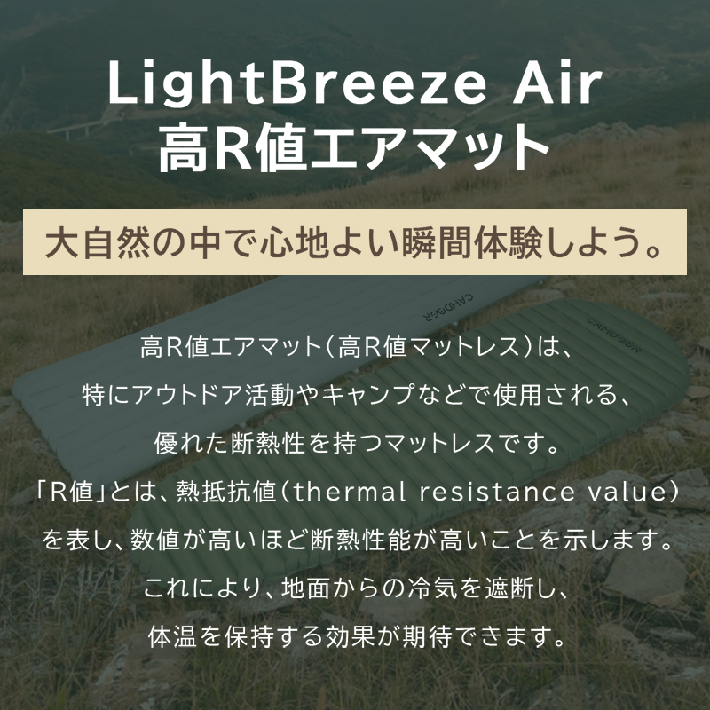 ・R値エアマットはなんですか? 高R値エアマット(高R値マットレス)は、特にアウトドア活動やキャンプなどで使用される、優れた断熱性を持つマットレスです。「R値」とは、熱抵抗値(thermal resistance value)を表し、スリーピングマットがどのくらい熱を逃さないか、つまり断熱力を評価する指標です。数値が高いほど断熱性能が高いことを示します。これにより、地面からの冷気を遮断し、体温を保持する効果が期待できます。