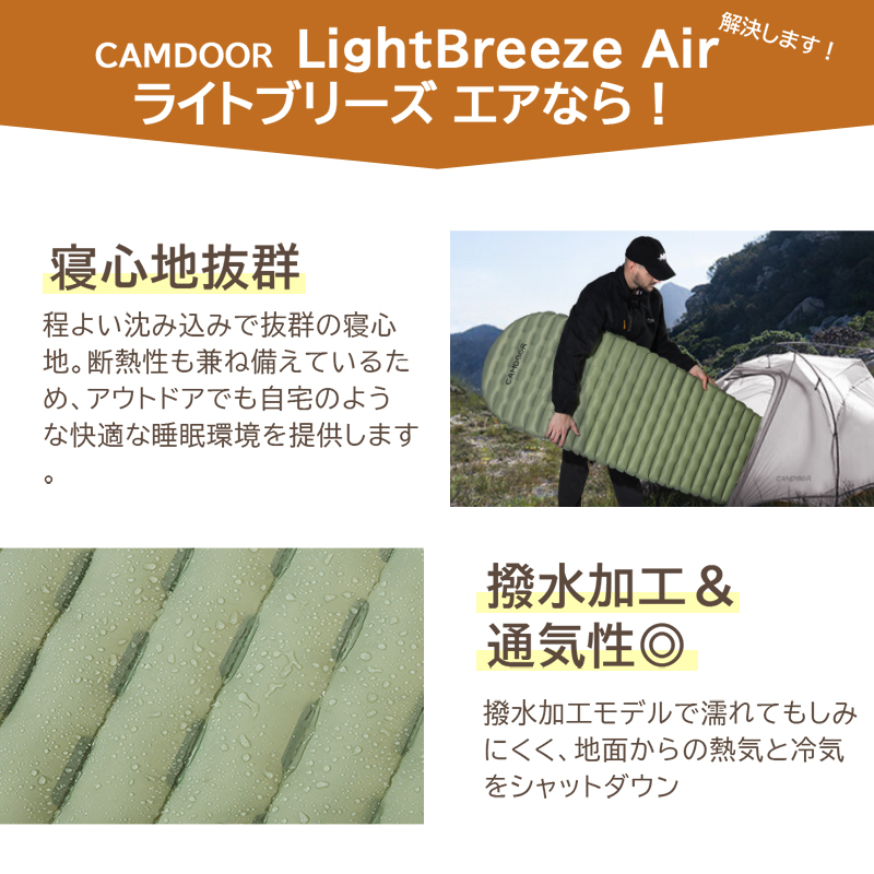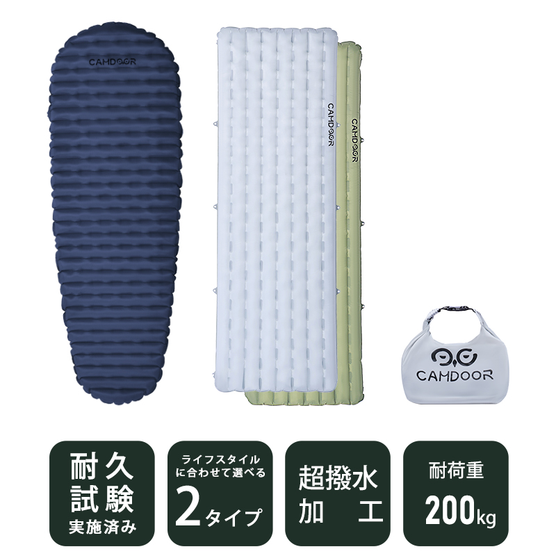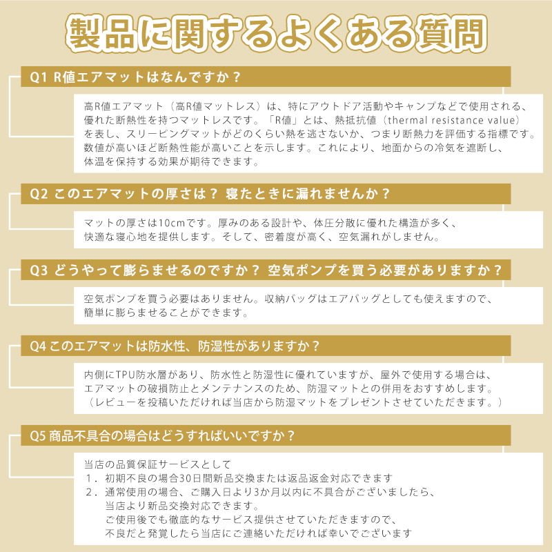 ・このエアマットは防水性、防湿性がありますか? 内側にTPU防水層があり、防水性と防湿性に優れていますが、屋外で使用する場合は、エアマットの破損防止とメンテナンスのため、防湿マットとの併用をおすすめします。(レビューを投稿いただければ当店から防湿マットをプレゼントさせていただきます。)