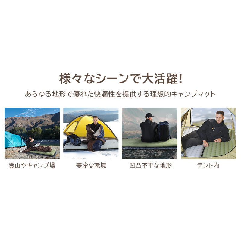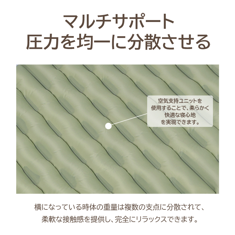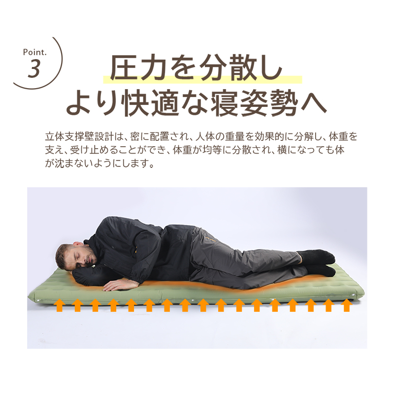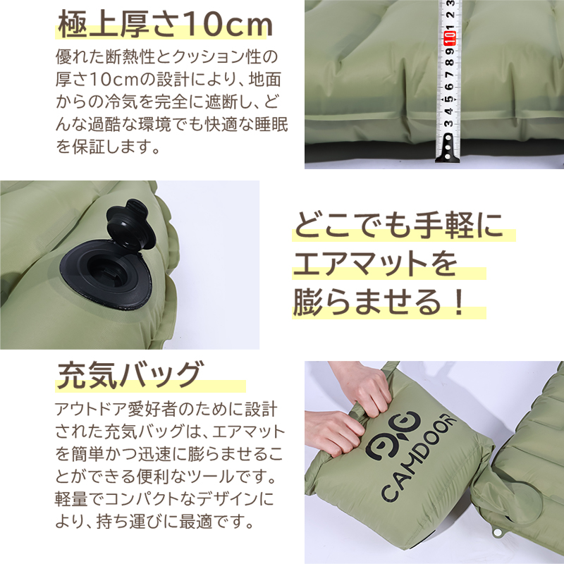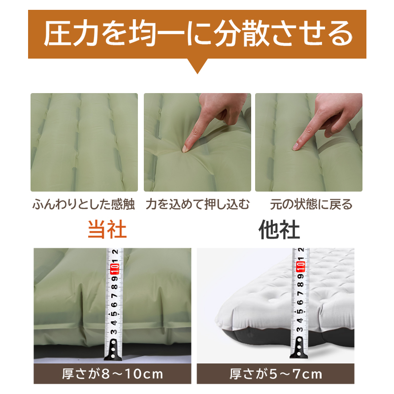 ・このエアマットの厚さは? 寝たときに漏れませんか? マットの厚さは10cmです。厚みのある設計や、体圧分散に優れた構造が多く、快適な寝心地を提供します。そして、密着度が高く、空気漏れがしません。