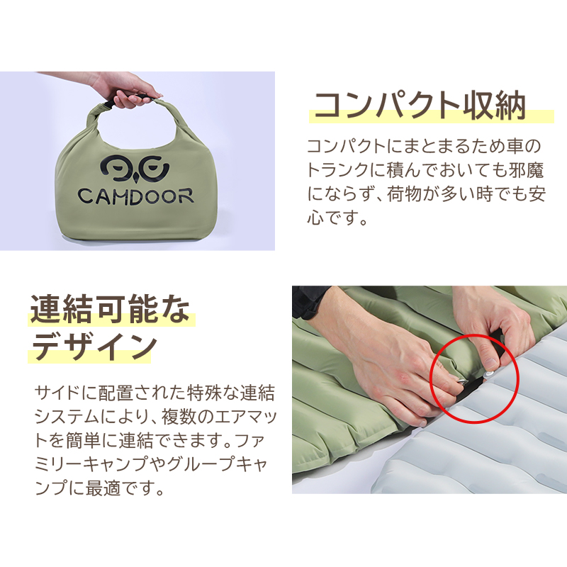 サイドに配置された特殊な連結システムにより、複数のエアマットを簡単に連結できます。ファミリーキャンプやグループキャンプに最適です。