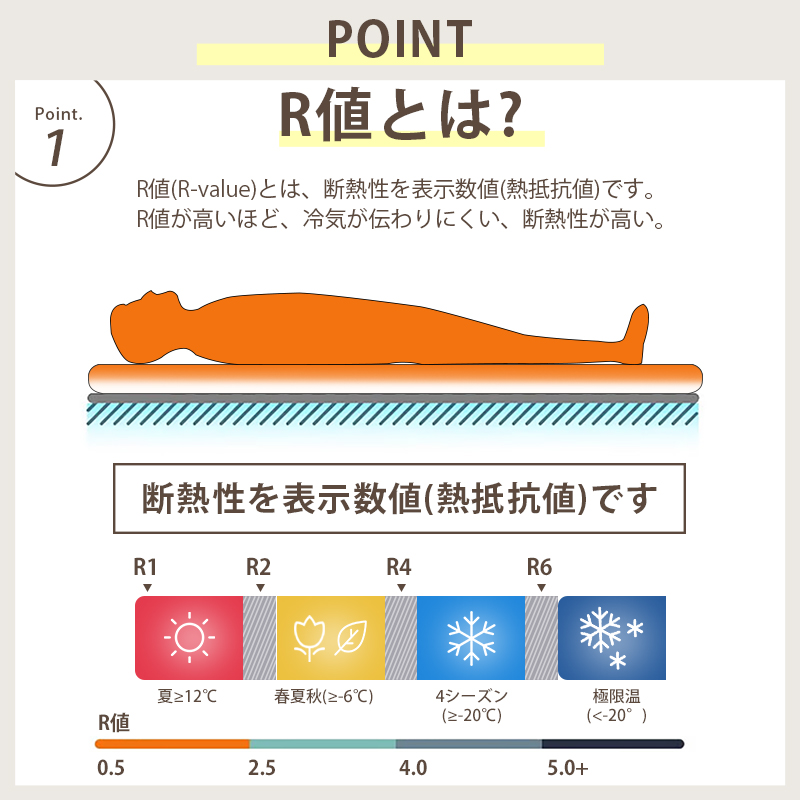 利点 保温効果: 高R値のエアマットは、特に冬季や寒冷地での使用において、地面からの冷気を効果的に遮断し、体温を保つことができます。 これにより、夜間の冷え込みを防ぎ、快適な睡眠をサポートします。 快適な睡眠環境: 寝心地の良さと断熱性の両方を兼ね備えているため、アウトドアでも自宅のような快適な睡眠環境を提供します。 多用途: キャンプやバックパッキングだけでなく、非常用や避難用としても利用可能です。 使用シーン キャンプ: 寒冷地や標高の高い場所でのキャンプに最適。 バックパッキング: 軽量で持ち運びしやすいため、長距離のハイキングやバックパッキングにも便利。 非常用: 災害時や緊急避難時に備えておくと安心。 高R値エアマットは、その優れた断熱性能と快適性から、アウトドア愛好者やキャンパーにとって非常に重要なアイテムです。選ぶ際には、使用する環境や季節、個々のニーズに合わせて最適なモデルを選ぶことが大切です。
