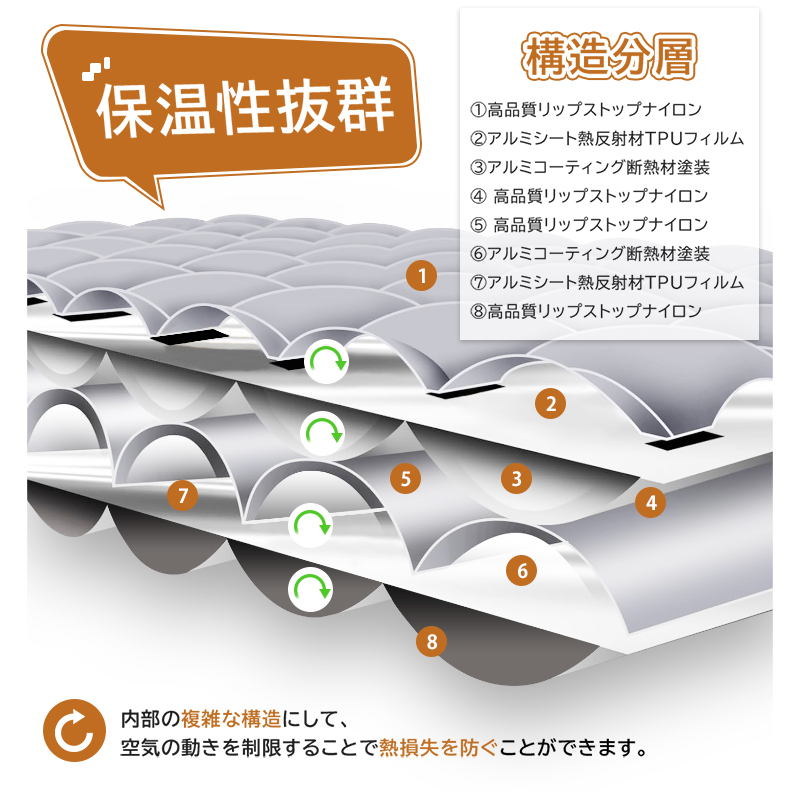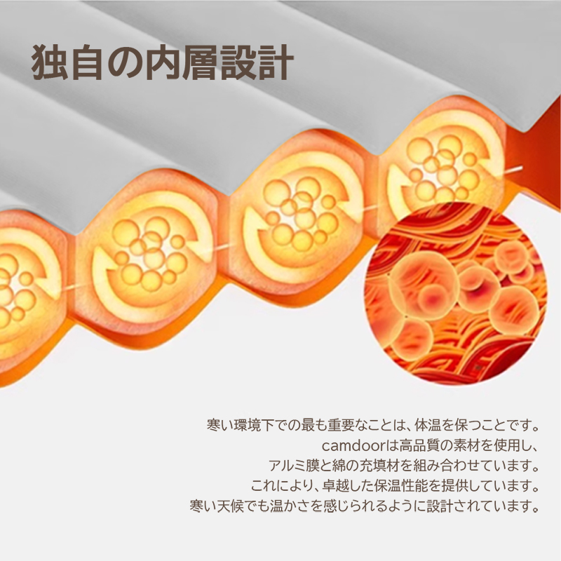 CAMDOORの高R値エアマットは、専利特許を取得した新しい内部構造で、より強力なサポート力と断熱性を備え、冷気を反射して体温を発散する熱反射素材を追加し、空気の循環による対流熱伝達による熱損失を防ぎます。-25℃の環境で従来のエアマットより保温性に優れています。