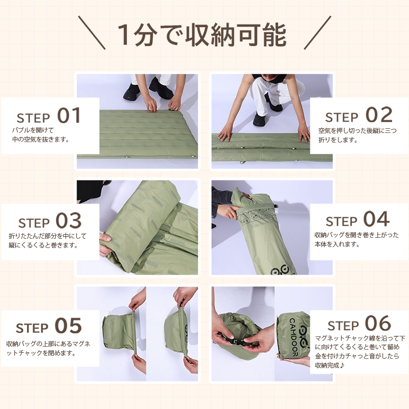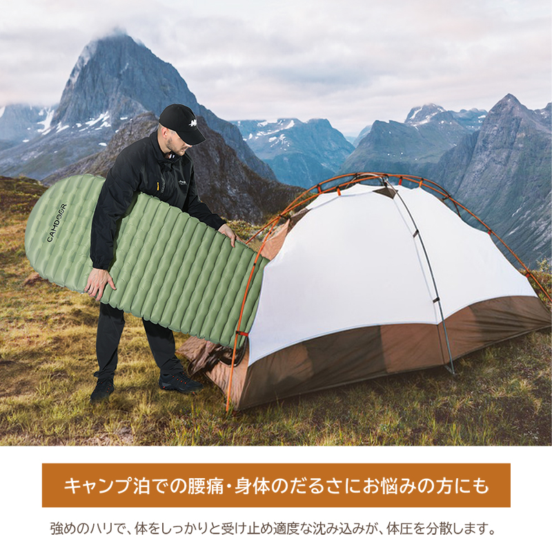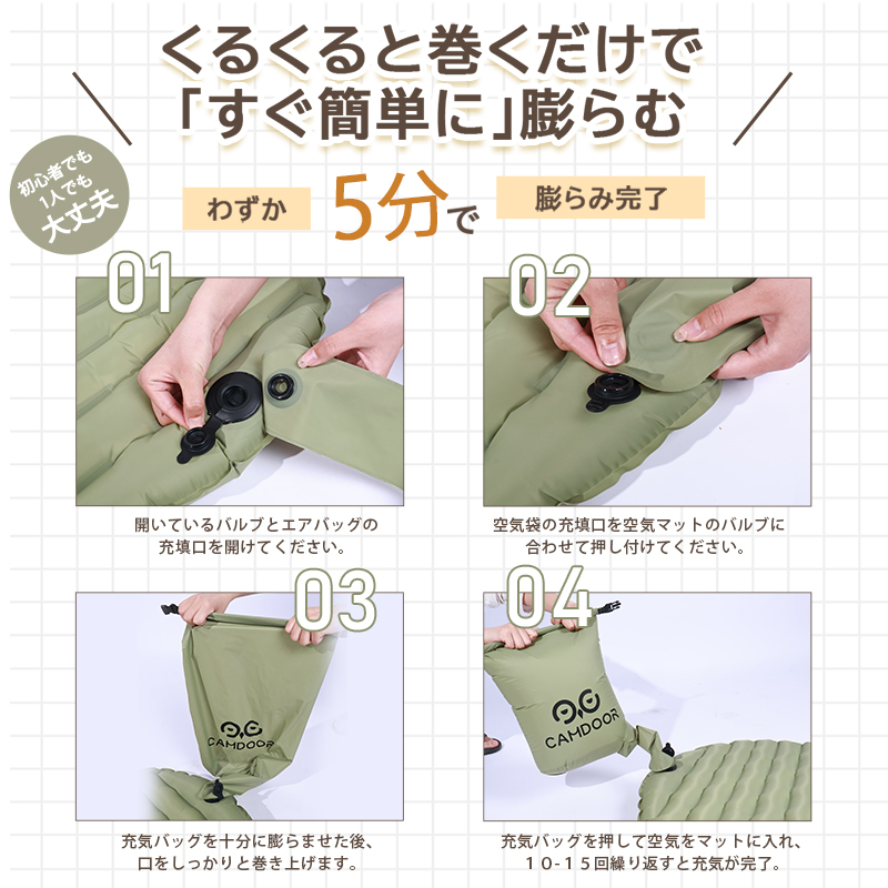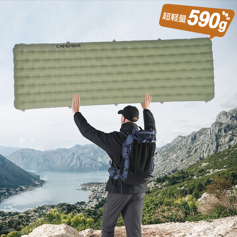 収納袋と空気入れ袋の一体設計で、コンパクトで場所を取りません。エアバッグに空気を吹き込めば、簡単にエアマットを膨らませます。わずか590gで、コンパクトに収納することができ、登山やキャンプ中の負担を軽減します。