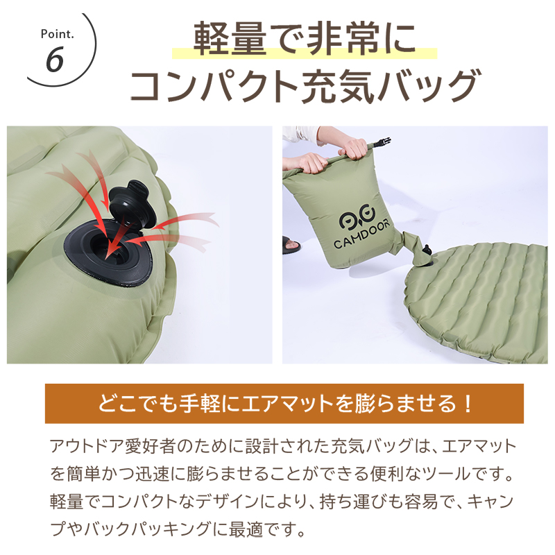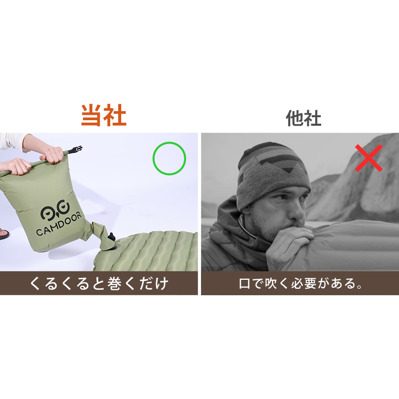 ・エアーバッグ付き 他社:エアーバッグなし、別購入する必要があります camdoor:エアーバッグが付属しており、簡単に膨らませることができます。