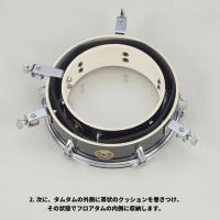 それらのドラムを入れたバッグごと、(2)のバッグに18"のバスドラムと合わせて収納することで、1つのバックに収めることが出来ます。コンパクトに持ち運べるだけでなく、省スペースでの保管も可能です。
